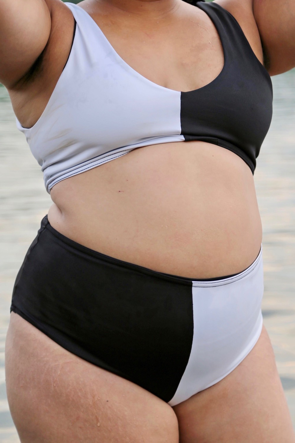 6. Two-Tone High-Waisted Bottoms: High-waisted bottoms with color block pattern.