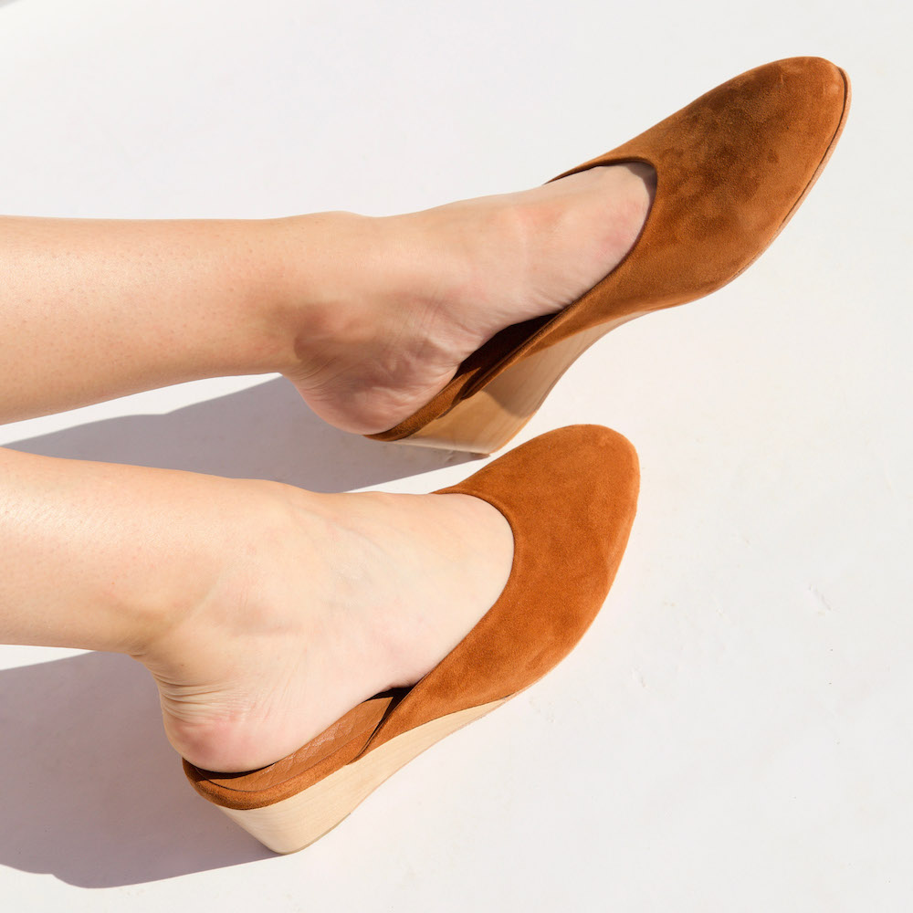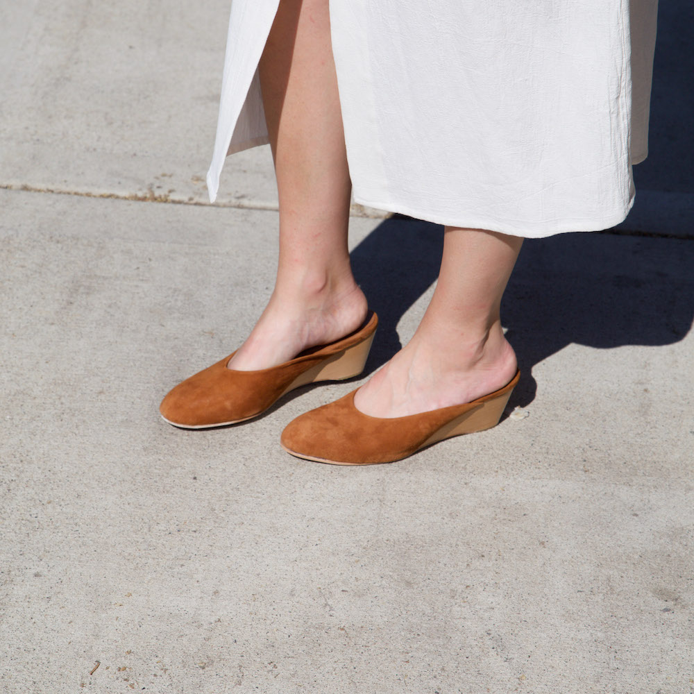 4. Ceri Hoover Gabby Wedge | Designed and made by Ceri Hoover, this slide-style wedge has a classic rounded suede toe and hand-crafted wooden heel. The low, gradual wedge allows for comprehensive support and added comfort with wear. Fine Italian suede upper. Lightly padded leather insole. 2.5″ lightly polished wedge. Hand-carved wooden sole. We recommend sizing up if in-between sizes.